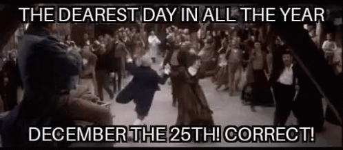 A joyous crowd celebrates the dearest day of the year, December 25th, with dancing and merriment.