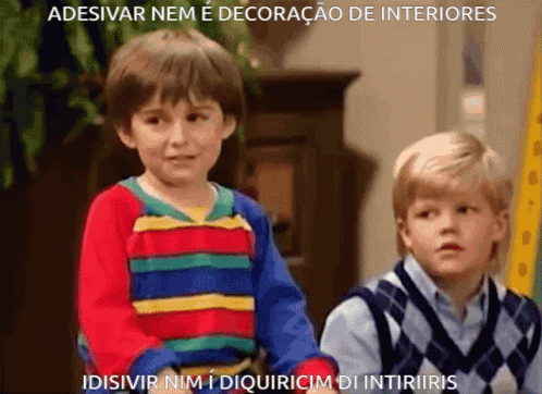 Two young boys, one making a distressed face, with a Portuguese meme caption about interior decoration.