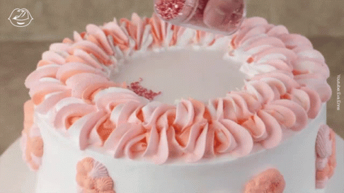 A hand sprinkles shimmering pink glitter onto a beautifully decorated white cake with elegant pink frosting swirls.