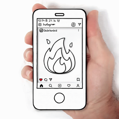 A hand holds a smartphone displaying Dede Bandaid's fire art on an Instagram post, featuring a low battery.