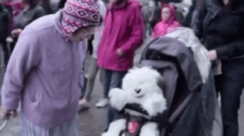 An elderly woman interacts with a talking Dedomenici Dog puppet in a stroller, part of a street art performance at Mintfest.