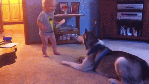 A baby in a diaper has a playful 'conversation' with a husky dog in a living room.