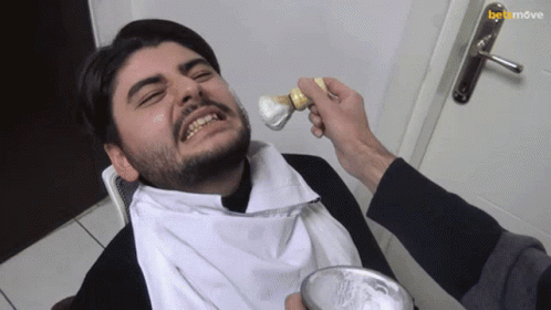 A man from Deep Turkish Web reacts dramatically to a loud sound during a shave, exclaiming his eardrum burst.