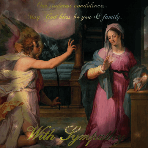A religious painting featuring an angel and a woman, overlaid with messages of 'Our sincerest condolences,' 'May God bless you & family,' and 'With Sympathy.'