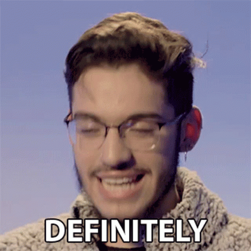 A man wearing glasses and a sweater smiles and says 'Definitely'.