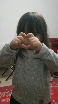 Defne, a cute little girl, makes a heart shape with her hands in front of her face.
