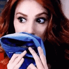 Defne Topal (Elcin Sangu), a woman with red hair, looks curious while holding a blue fabric object.
