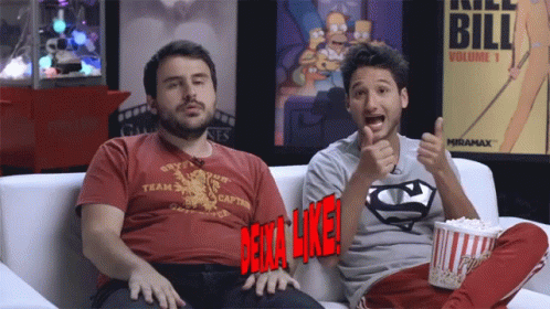 Two men on a couch, one giving thumbs up, with 'Deixa Like!' (Leave a Like!) overlay, encouraging engagement.