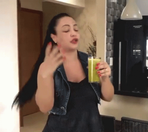 Woman drinks a delicious green juice with an expressive, surprised reaction.