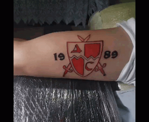 Delije fan's arm tattoo featuring a shield emblem, crossed swords, and the year 1989.