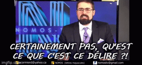 A man in a suit and tie reacts with disbelief, asking "What is this delirium?!" in front of a NOMOS-T logo.