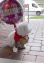 A cute white dog, wearing a red bandana, delivers a special birthday gift with a 'Happy Birthday' balloon.