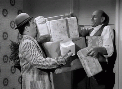 Two men engage in a comical struggle as one attempts to deliver a towering stack of packages to the other.