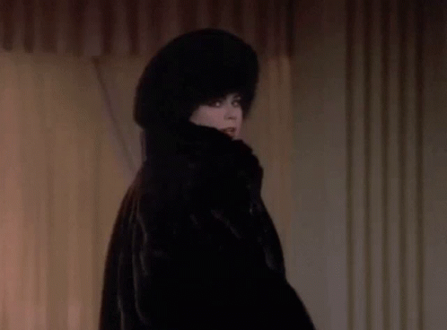 Delta Burke, as Suzanne Sugarbaker, smiles on the runway in a fur coat and hat during a Designing Women fashion show.
