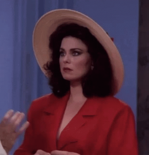 Delta Burke as Suzanne Sugarbaker, wearing a red jacket and straw hat, looks thoughtful and then smiles.