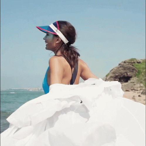 Demetözdemir smiles brightly on the beach, wearing a vibrant blue swimsuit and a stylish visor.