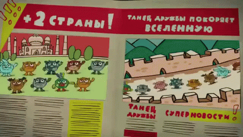 Smeshariki characters celebrate Friendship Day, dancing in India (Taj Mahal) and China (Great Wall) in a newspaper spread.