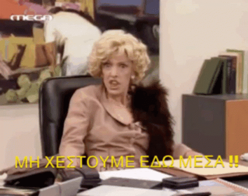 Deni Markora, a woman with blonde hair, reacts with a frustrated expression, accompanied by a Greek caption.