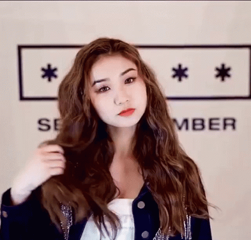 Denise from Secret Number performs a stylish hair flip, showcasing her long, wavy brown hair.