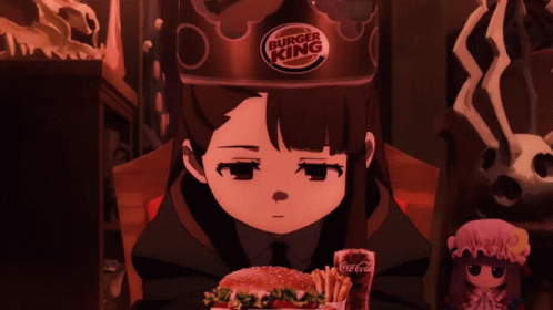 Deniz Can and Acchan, an anime girl wearing a Burger King crown, sits with a Burger King meal and Coca-Cola.