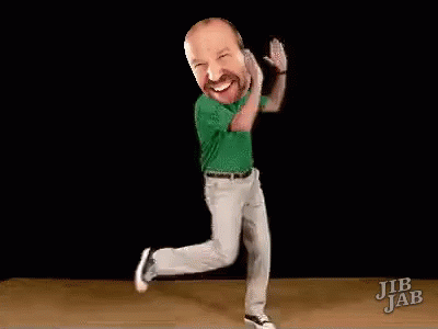 A man with a superimposed head dances happily in a green shirt and white pants, celebrating dental hygiene and no cavities.