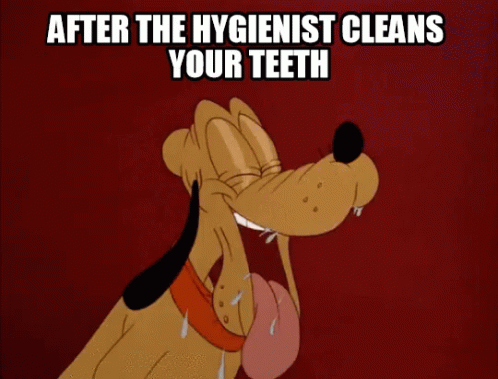 Pluto cartoon meme showing sparkling clean teeth after a hygienist visit, with text 'AFTER THE HYGIENIST CLEANS YOUR TEETH'.