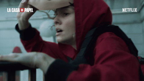 Denver from Money Heist (La Casa de Papel) yells while lifting her iconic Salvador Dalí mask.