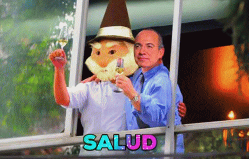 Jaime Duende and a man resembling Jeff Bezos (representing Calderón) toast with drinks, with 'Salud' visible.