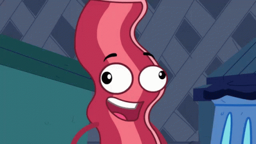 Animated bacon character with big eyes winks and smiles in a funny, derpy way.