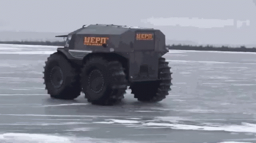 A Russian SHERP all-terrain vehicle performs a drift on a vast frozen lake.