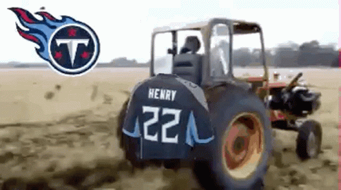A tractor, adorned with Derrick Henry's #22 Tennessee Titans jersey, drives across a muddy field.