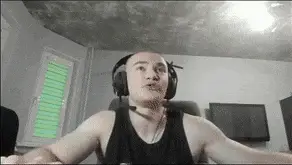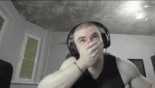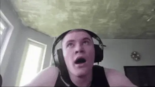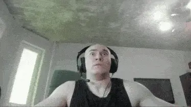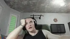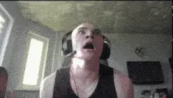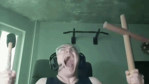 Man in headphones screaming intensely, holding a hammer and a cross-like object.