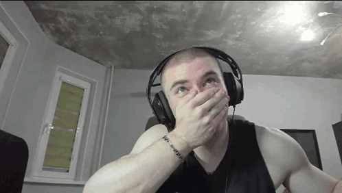 Derzko69, a man wearing headphones, reacts with a shocked expression, covering his mouth in surprise.