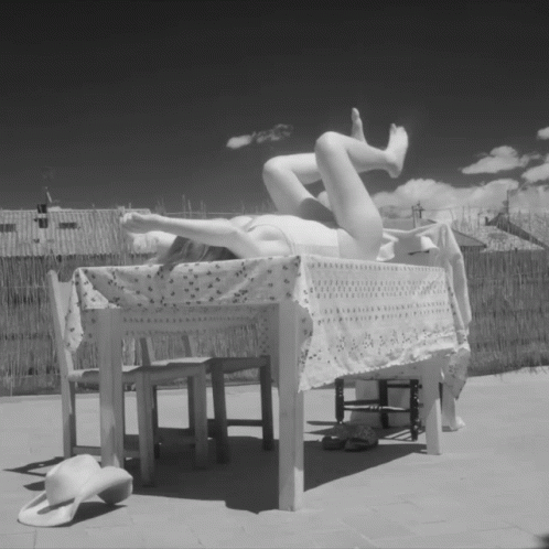 Rigoberta Bandini is seen relaxing on a table outdoors, enjoying the sun in a serene moment.