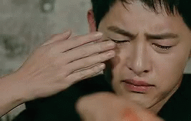 Song Joong Ki as Yoo Shi Jin crying, comforted by a woman's hand wiping his eyes in Descendants of the Sun.