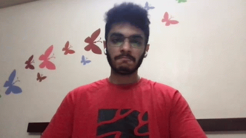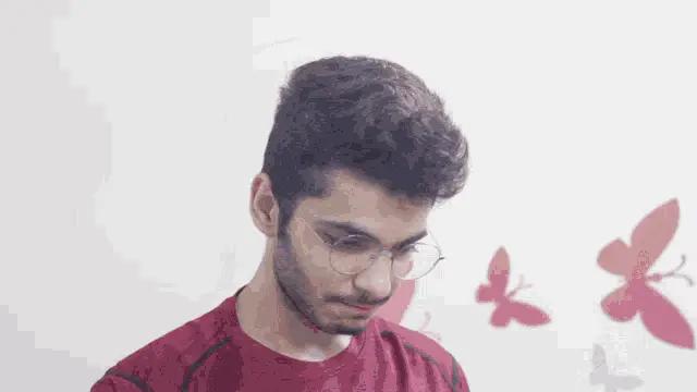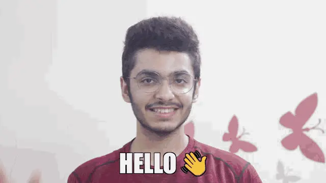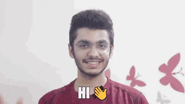 Aashish Karia, the desimarketer, makes a rock on hand gesture while wearing glasses and a red t-shirt.