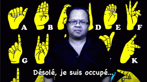 Man in glasses signs 'Sorry, I am busy' in French Sign Language (LSF) against an alphabet background.