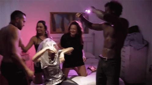 A lively group of friends dancing on a bed during a 'Despedida De Solteira' (hen party) with pink lighting.