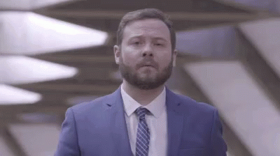 A man with a beard in a blue suit and tie stands in a modern building, looking around with a thoughtful expression.