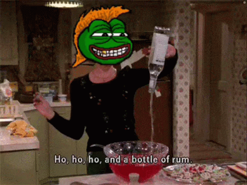 Desultor Wgmis, a Pepe the Frog character, pours rum into a bowl, exclaiming 'Ho, ho, ho, and a bottle of rum.'