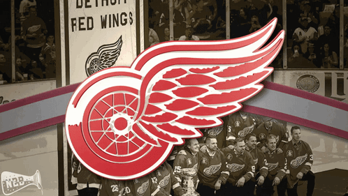 The iconic Detroit Red Wings logo is prominently displayed, set against a backdrop of the team celebrating a championship.