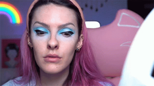 Karen Bachini reacts with disappointment as her eyeliner application doesn't go as planned, showing her pink hair and blue eyeshadow.