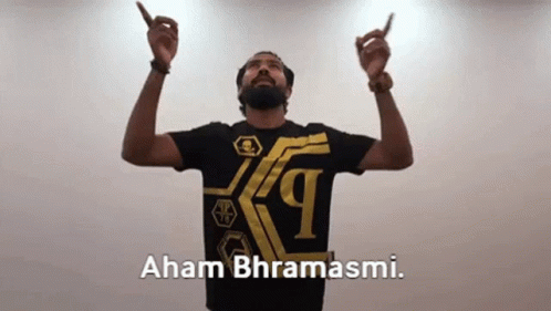 Devindar Walmiki raising hands, looking up, with 'Aham Bhramasmi' on his shirt, reflecting a spiritual moment.