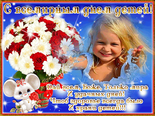 A happy little girl with a bouquet of red and white flowers, featured on a greeting card celebrating World Children's Day.
