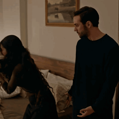 Devran Alaz and Hazal Subaşı engage in a playful pillow fight in a bedroom.