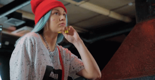 Young vlogger with blue hair and red beanie, looking attentive and thoughtful.