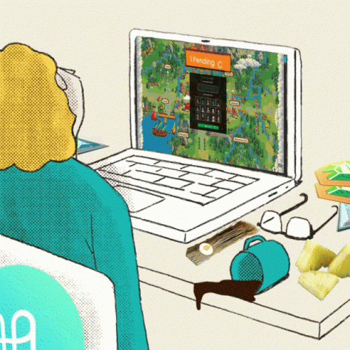 A person plays the game DefiKingdoms on a laptop, with '1 Pending C.' visible on the screen, amidst a spilled coffee.