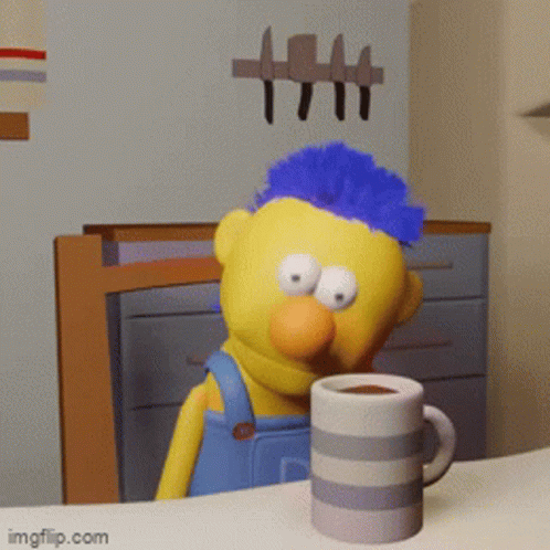 Yellow Guy from Don't Hug Me I'm Scared reacts with a surprised 'WOW' while sitting at a table with coffee.