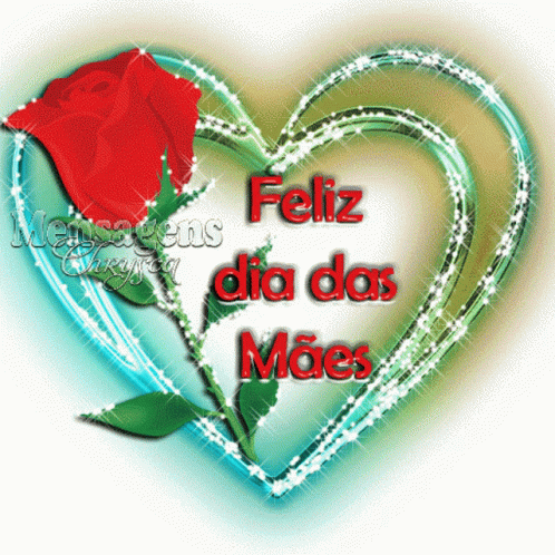 A beautiful animated greeting for Mother's Day featuring a sparkling heart, a red rose, and the message 'Feliz Dia das Mães'.