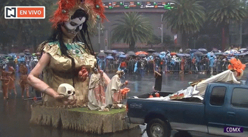 Spectacular Day of the Dead parade float featuring a large Catrina figure holding a skull in rainy Mexico City.